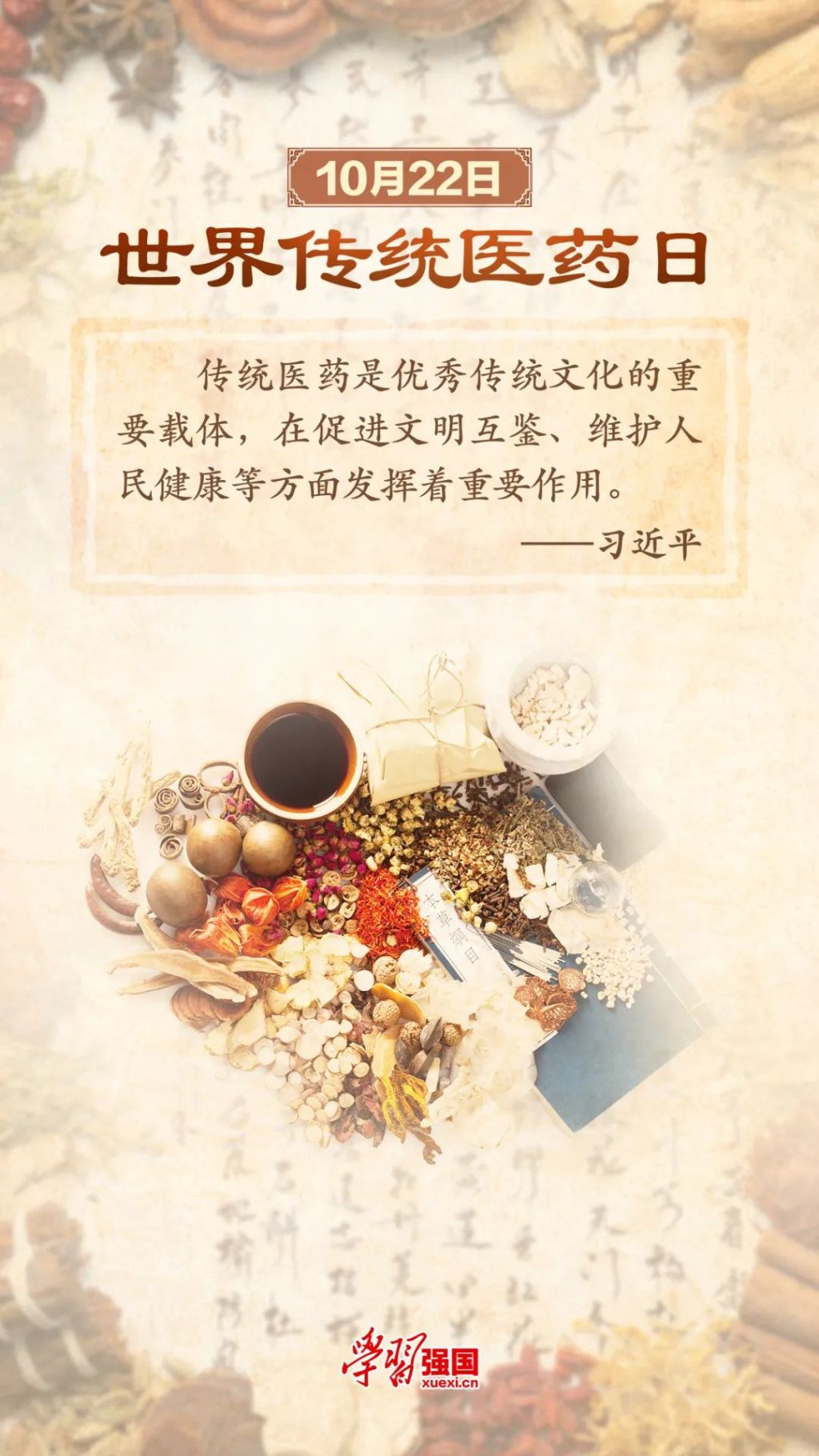 每年的10月22日,被定为“世界传统医药日”。近年来,中医药的独特疗效正被全世界所关注,随着人类疾病谱的变化和“回归自然”潮流的兴起,中医药受到世界各国的高度重视,世界传统医药发展迅速,国际地位不断上升。人类健康需要传统医药,世界各国的传统医药是国际医药界不可多得的宝贵财富。